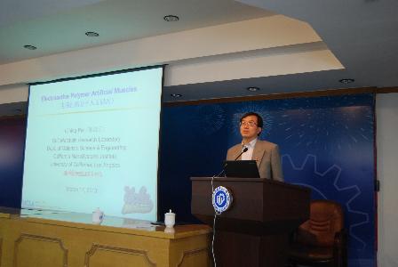 受聘仪式后,裴启兵教授做了题为“Electroactive Polymer Artificial Muscles”的精彩学术报告。裴教授的学术报告结合高分子材料特有的电学、力学和介电性能,通过电能与机械能的相互转换,进行具有特殊性能的器件设计和研制。报告的第一部分是基于电能转化为机械能的理论所进行的研究。通过对导电高分子施加不同方向和大小的电压,设计成为相应器件,使其能够通过对变化电压的响应进行弯曲、伸展,模拟人体的肌肉的活动。报告的第二部分是基于机械能转化为电能的研究,如何实现将储存在高分子弹性体中的弹性势能转化为电能。在新能源领域,开拓了一个新的研究思路。报告结束后,我校师生就自己感兴趣的方面与裴启兵教授做了深入的交流。