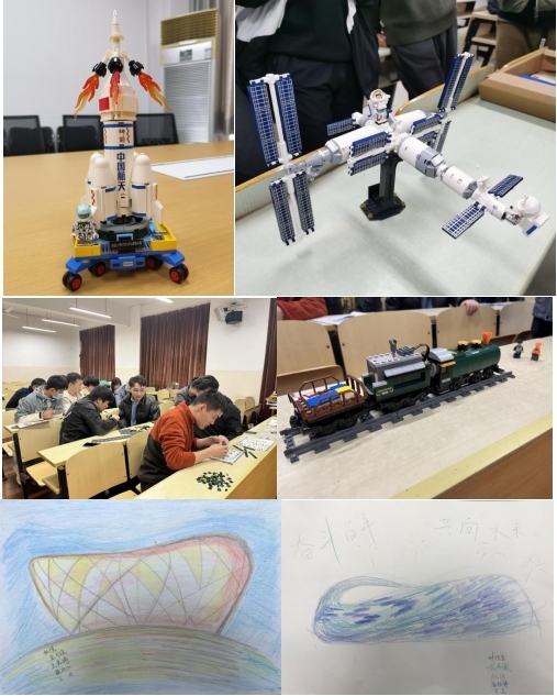 第5组搭建长征二号运载火箭模型和载人空间站模型,发扬“特别能吃苦、特别能战斗、特别能攻关、特别能奉献”的载人航天精神。第11组拼装火车积木,学习“吃苦、创业、团结、奉献”的老青藏线精神。第6组绘制2008年奥运和2022年冬奥会的标志场馆画,传承“为国争光、无私奉献、科学求实、遵纪守法、团结协作、顽强拼搏”的中华体育精神。第7组制作长征故事剪纸,用剪纸艺术传承长征精神。第9组制作南昌起义主题模型,学习继承不畏强敌,前赴后继的革命精神。